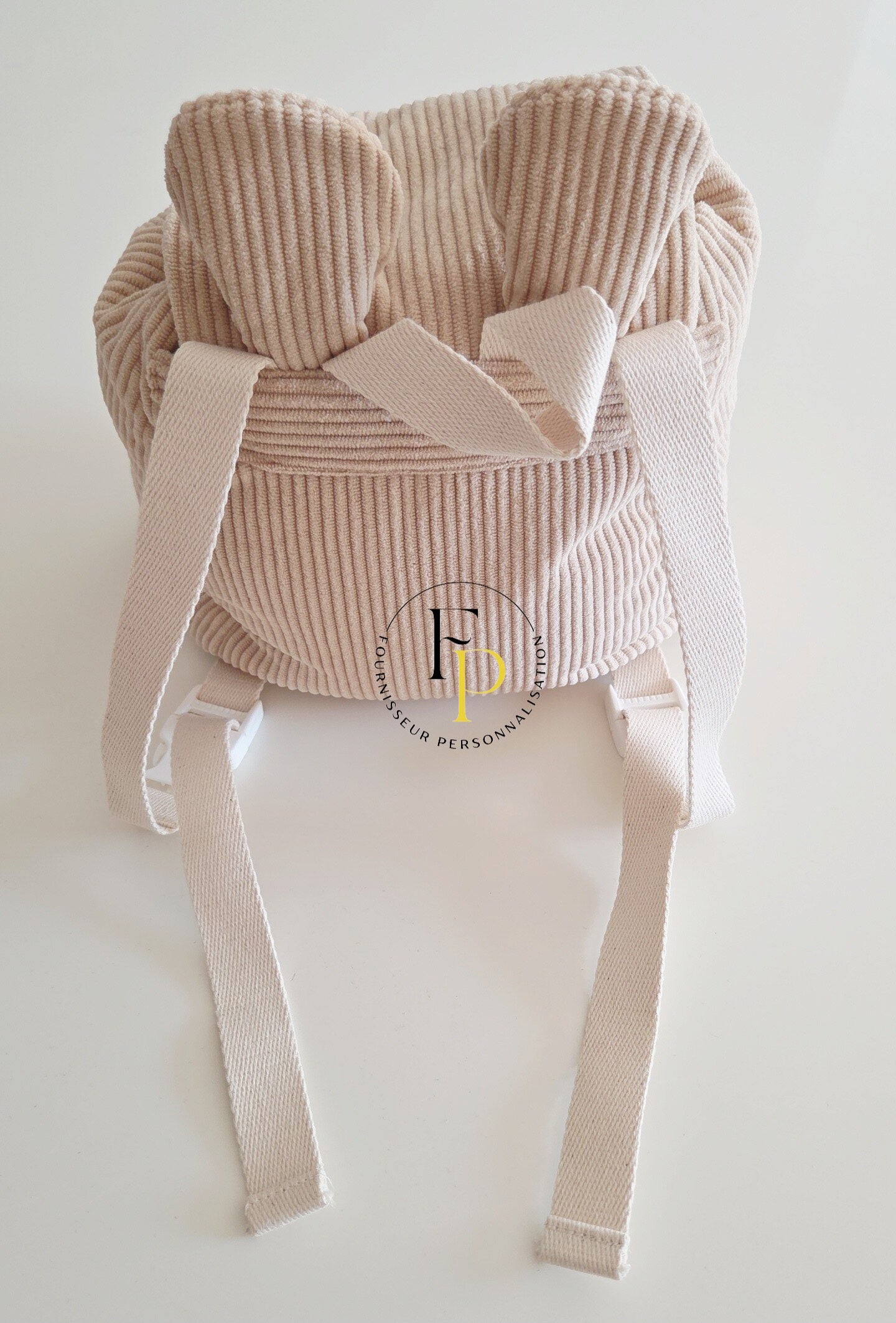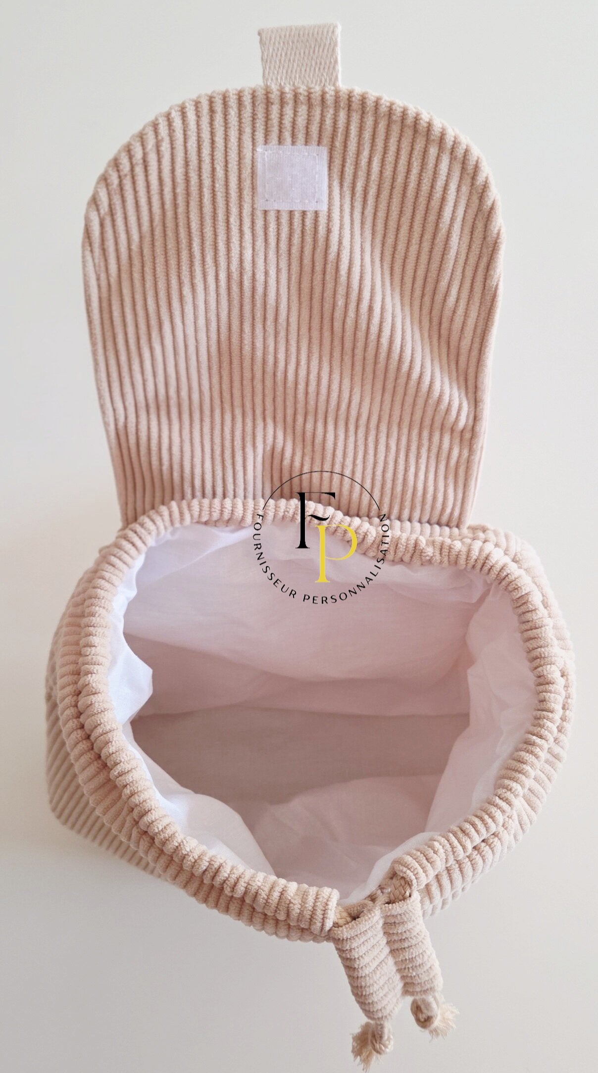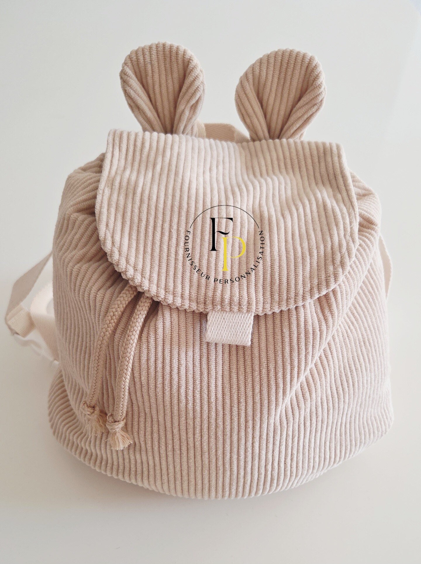 Petit sac à dos à bretelles ajustables. Poignée au dessus et petites oreilles intégrées. Fermeture facile avec cordelettes et scratch.